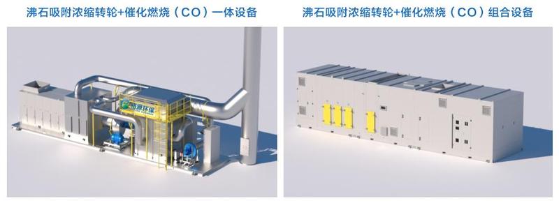 VOCs废气通过疏水性沸石浓缩转轮后,能有效被吸附于沸石中,达到去除的目的,经过沸石吸附的挥发性有机物的洁净气体,直接通过烟囱排放到大气中,转轮持续以每小时1-6转的速度旋转,同时将吸附的挥发性有机物传送至脱附区。于脱附区中利用一小股加热气体将挥发性有机物进行脱附,脱附后的沸石转轮旋转至吸附区,持续吸附挥发性有机气体。脱附后的浓缩有机废气送至催化燃烧(CO),在300°的温度下氧化分解,将有机废气氧化成CO₂、H₂O。